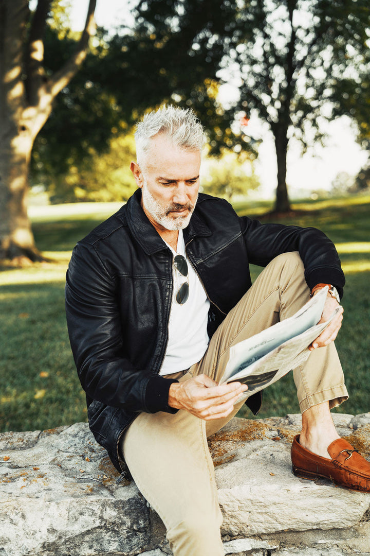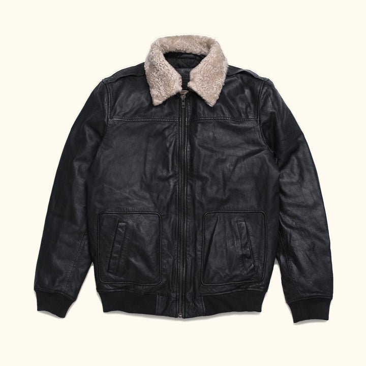 Our black leather bomber jacket features a full zip up closure, color matched ribbed cuffs and waist, and a unique detachable sherpa collar that can be removed, or worn, to provide extra warmth and comfort for brisk nights on the town or chasing the horizon.
