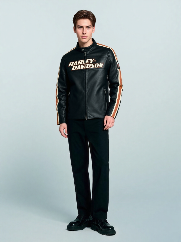 The Black Harley Davidson Biker Motorcycle Jacket is the epitome of strength, style, and durability. Crafted from genuine cowhide leather, this jacket is designed for serious bikers who demand both performance and fashion. Whether you're cruising down the highway or enjoying a night out, this jacket brings an unbeatable combination of comfort and rugged appeal. Featuring the iconic Harley Davidson brand, this jacket is a must-have for motorcycle enthusiasts.