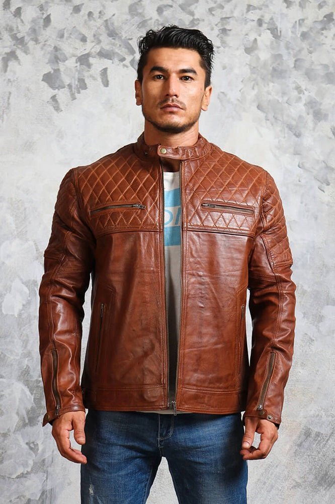 Men's Brown Biker Jacket - Diamond Quilted Leather Jacket